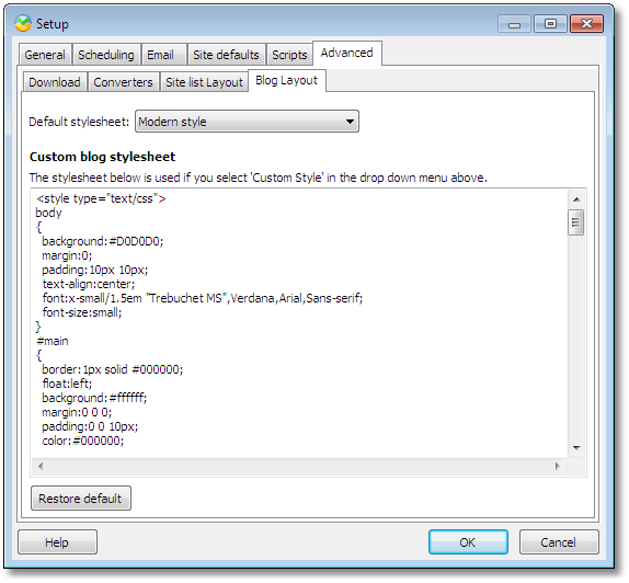 You can change the HTML layout to suit your taste. To edit the CSS style sheet that controls the layout, select Setup from the File menu or Setup from the Toolbar. On the setup window, select Blog Layout on the Advanced tab.